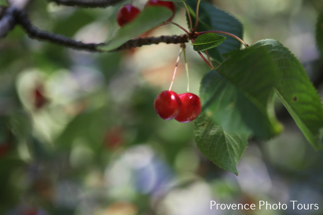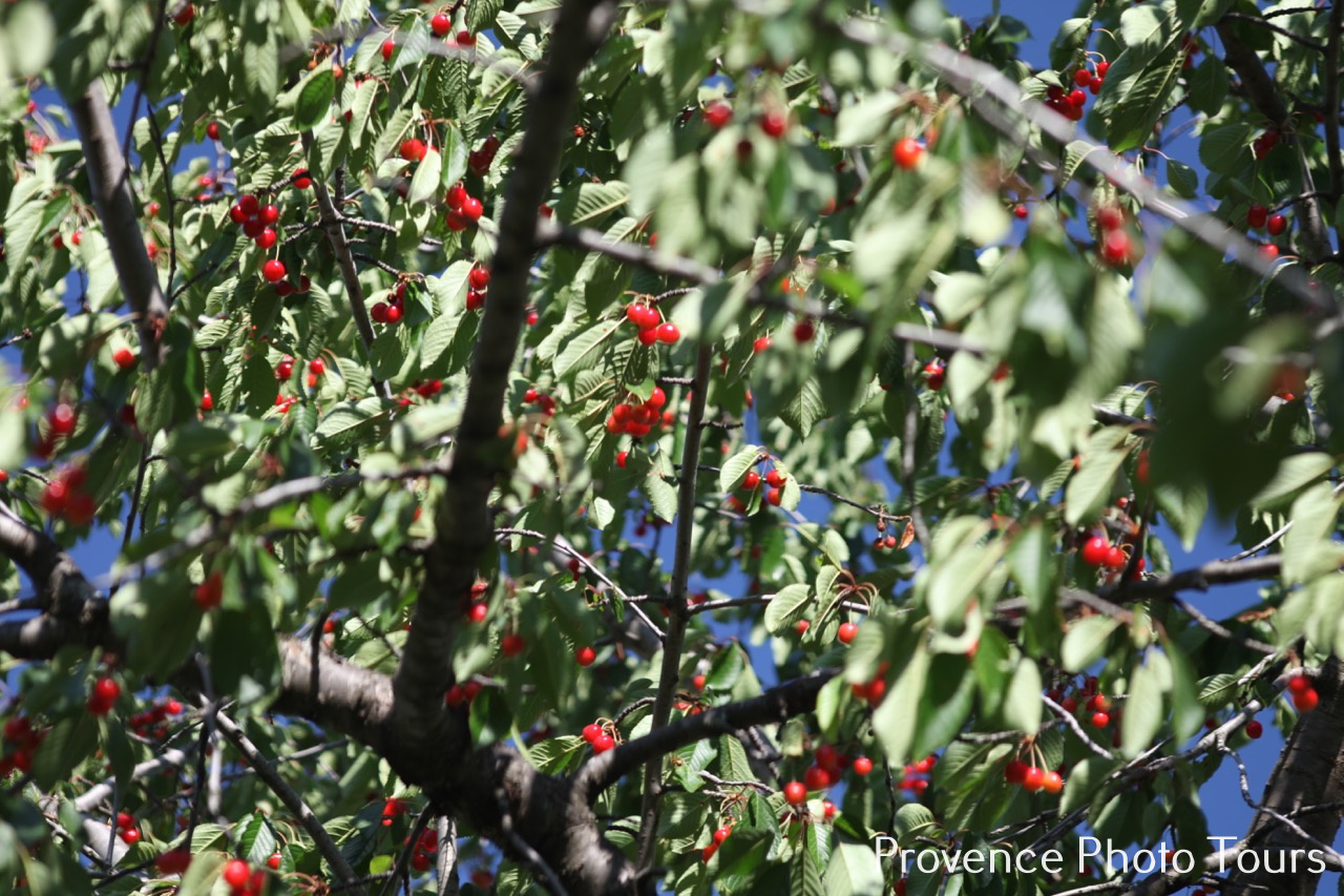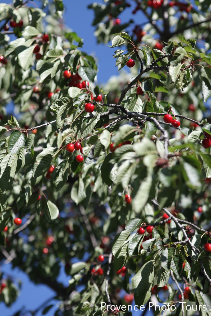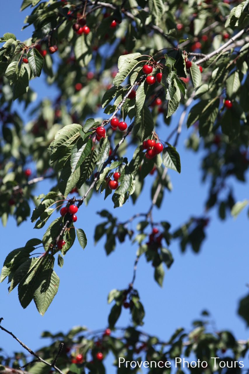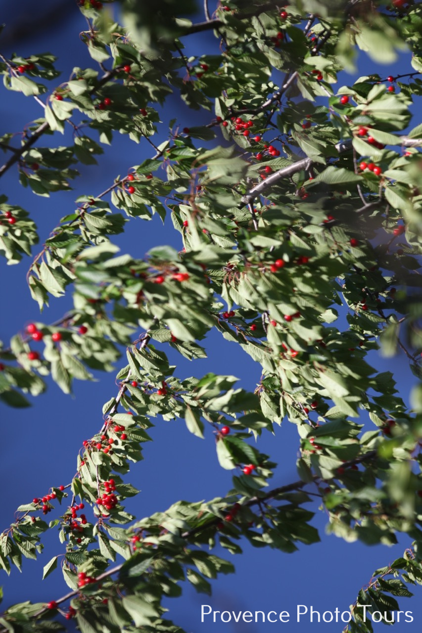 Here in Provence late May early June we have Cherry time when the trees bear fruit and we can eat them straight off the branches and savour their warm sweet full flavour. Big black ones, small blood coloured ones and mine which are small slightly sharp dark red ones. (Off course they are all BIO on my estate.)